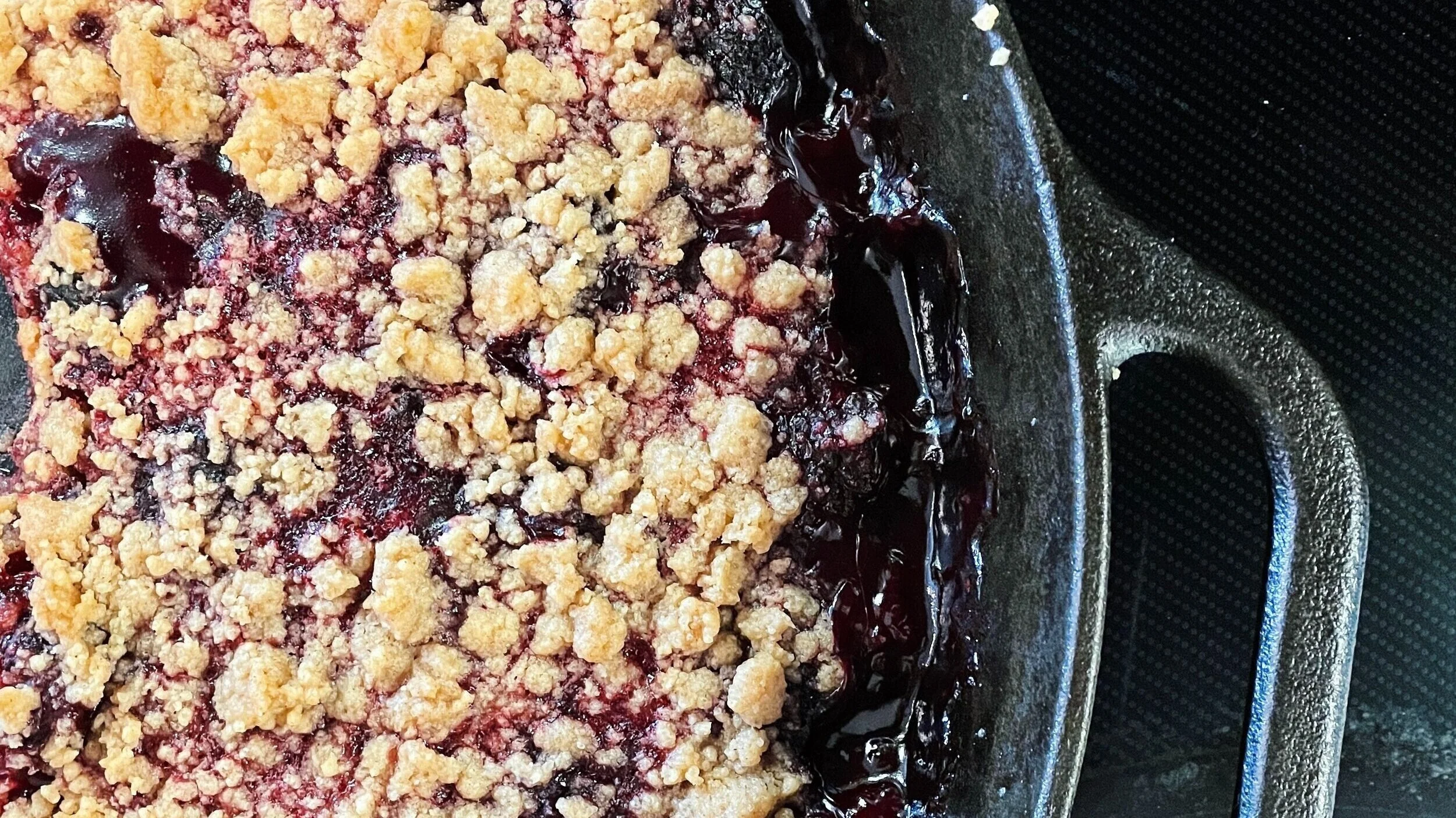 Butter a 12” cast iron or oven-safe skillet. Pour in your filling mixture. Using your fingers, sprinkle your crumble over top to get an even coating. Bake for 45 minutes, or until the crumble starts to look golden brown and the berry mixture is bubbling. Serve! Top with whipped cream or ice cream and enjoy for dessert or even breakfast.