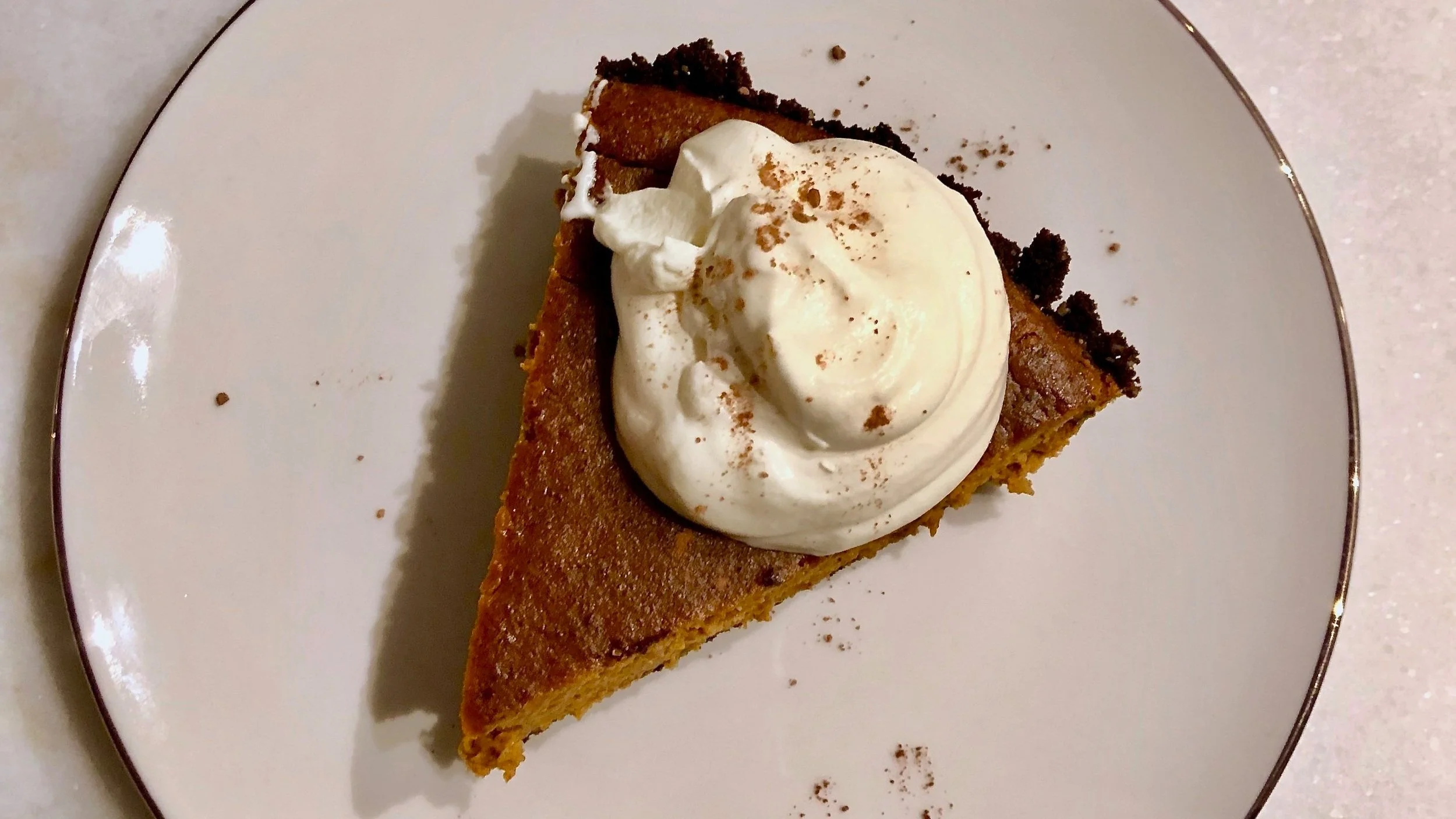 While the filling has a number of ingredients, it’s extremely simple to prepare. Combine your pumpkin, tahini, eggs, maple syrup, sugar, cinnamon, cocoa, nutmeg, ginger, vanilla and salt in a large mixing bowl with a whisk or spatula. Then add in your milk once blended. Pour into cooled prepared crust, and bake at 350°F for 45 minutes. Let cool and refrigerate.