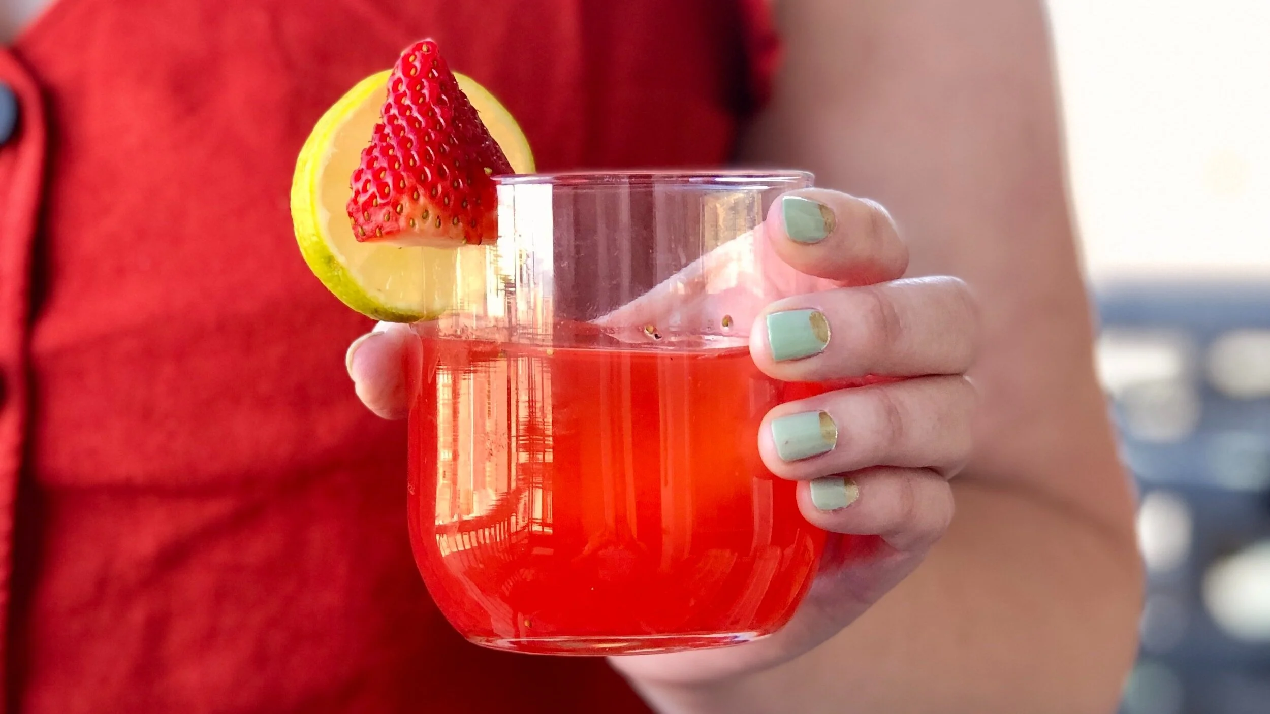 Place your two trimmed and cleaned strawberries in a shaker tin. Top with mezcal, ancho reyes, lime juice, and agave. Muddle the strawberries into the other ingredients to get the full infusion. Add ice and shake until the tin is frosty. (Note: I didn’t have any, but a tajin and salt rim would go very nicely with this drink!) Double strain into your margarita glass of choice over ice, and garnish with a lime wheel and strawberry slice.