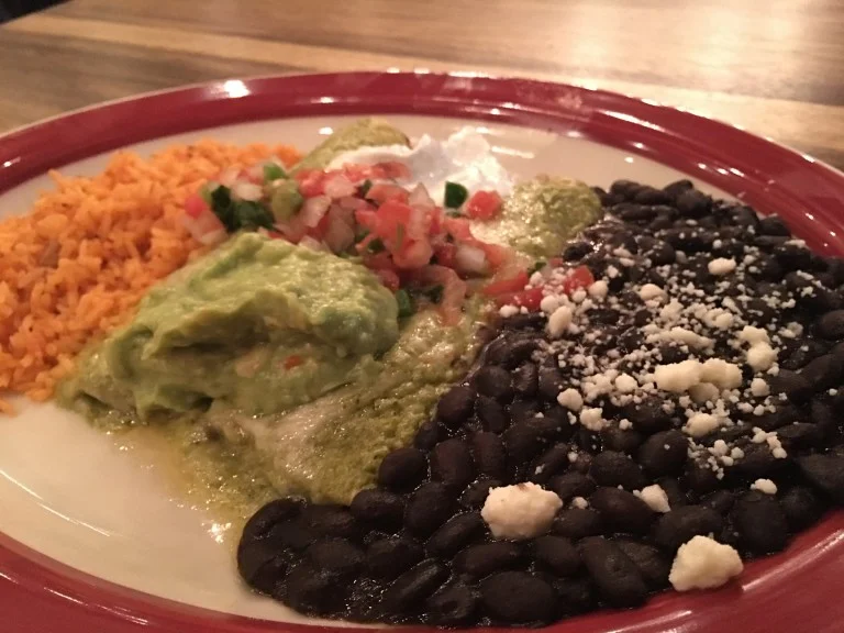 Pork enchiladas with poblano cream sauce, black beans and rice topped with guacamole and pico de gallo. Photo by Rachael Worthington.