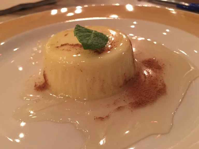 Flan drenched with Mezcal tequila-infused honey and adorned with cinnamon and mint.